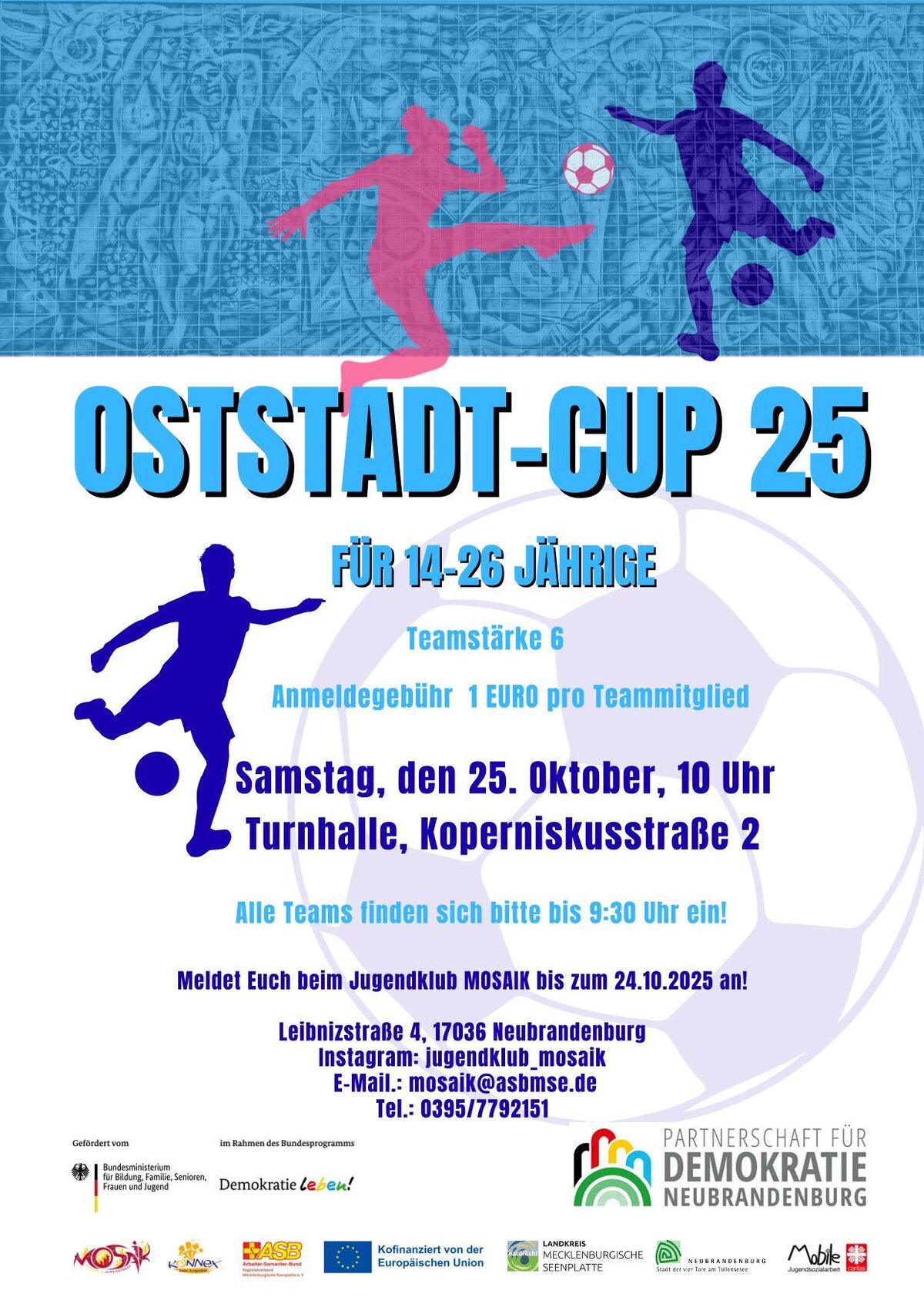 Das Vorhaben knüpft an das Projekt „Oststadt-Cup 2024“ im Vorjahr an (s. Projekte 2024 - Nr. 17). Angesichts der sehr guten Resonanz, die dieses Projekt erzielt hat, werden Jugendliche der Neubrandenburger Oststadt auch 2025 eigenständig ein eintägiges vereinsungebundenes Fußballturnier organisieren, an dem Jugendliche aus ganz Neubrandenburg in selbstgebildeten Teams teilnehmen. Sie planen den Turnierablauf und die Moderation, fertigen Turniermappen an und legen fest, welche Prämierungen es geben soll, wie die Ergebnisse angezeigt und dokumentiert und wer welche Aufgaben übernimmt. Auch die Durchführung des Turniers erfolgt weitgehend durch die Jugendlichen selbst. Unterstützt werden Sie durch den Jugendclub MOSAIK, durch die Mobile Jugendsozialarbeit der Caritas, durch den Kinder- und Jugendtreff Konnex und das Stadtteilbüro Ost. Durch das Miteinander in Planungs- und Durchführungsphase werden soziale Barrieren zwischen den Jugendlichen abgebaut, das Gemeinschaftsgefühl und das eigenverantwortliche gesellschaftliche Engagement im und für das eigene Lebensumfeld gestärkt. Ziel ist es, durch sportliche Aktivitäten positive Lebensperspektiven zu eröffnen, soziale Teilhabe zu verbessern, sowie Gewaltfreiheit, gegenseitigen Respekt und Toleranz unter den teilnehmenden Jugendlichen zu fördern.
